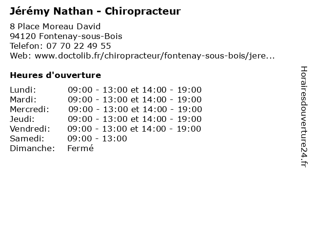 | Lundi | 09:00-13:00 et 14:00-19:00 |