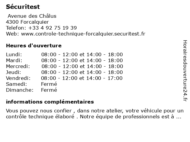 1 Sécuritest Contrôle Technique Automobile Sisteron (Distance: 28,09 km) 72 Avenue Jean Jaures, 04200 SISTERON automobile, contrôle, sisteron, sécuritest, technique 2 Sécuritest Contrôle Technique Automobile APT (Distance: 34,24 km) 22 Chemin Du Viaduc, 84400 APT apt, automobile, contrôle, sécuritest, technique 3 Sécuritest Arnaud Contrôle Auto Affilié (Distance: 38,69 km) Lotissement Artisanal du Plan, 05300 Laragne-Montéglin affilié, arnaud, auto, contrôle, sécuritest 4 Sécuritest Contrôle Technique Automobile (Distance: 50,85 km) D1075, 05700 Serres automobile, centre de contrôle technique, contre visite, contrôle, contrôle pollution, contrôle technique, contrôle technique automobile, securitest, sécuritest, technique, véhicule léger 5 Sécuritest Contrôle Technique Automobile (Distance: 54,35 km) Lotissement Zone d'activité de Lapalun, 26170 Buis-les-Baronnies automobile, centre de contrôle technique, contre visite, contrôle, contrôle pollution, contrôle technique, contrôle technique automobile, securitest, sécuritest, technique, véhicule léger 6 Sécuritest Contrôle Technique Automobile BUIS LES BARONNIES (Distance: 54,35 km) Za La Palun, 26170 BUIS LES BARONNIES automobile, baronnies, buis, contrôle, les, sécuritest, technique |