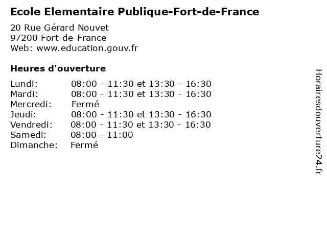 1 Ecole Elementaire Publique-Fort-de-France (Distance: 0,57 km) . Crozanville, 97200 Fort-de-France cours, de, ecole, elementaire, fort, france, publique, services 2 Ecole Elementaire Publique-Fort-de-France (Distance: 0,70 km) . Rue Dr Juvenal Linval, 97200 Fort-de-France cours, de, ecole, elementaire, fort, france, publique, services 3 Ecole Elementaire Publique-Fort-de-France (Distance: 1,05 km) . Route de Didie, 97200 Fort-de-France cours, de, ecole, elementaire, fort, france, publique, services 4 Ecole Elementaire Publique-Fort-de-France (Distance: 3,98 km) 7 Route de Balata, 97200 Fort-de-France cours, de, ecole, elementaire, fort, france, publique, services 5 Ecole Elementaire Publique-Fort-de-France (Distance: 5,10 km) . Rivière l'Or, 97212 Fort-de-France cours, de, ecole, elementaire, fort, france, publique, services 6 Ecole Elementaire Publique Jean-Baptiste Rouamsim (Distance: 0,42 km) . Place Abbé Grégoire, 97200 Fort-de-France baptiste, cours, ecole, education, elementaire, jean, publique, rouamsim, services, école, élémentaire |