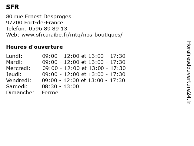1 SFR (Distance: 0,33 km) 18 rue Moreau De Jonnes, 97200 Fort-de-France accessoire, français, mobile, opérateur, service, sfr, télécommunications, vente 2 SFR (Distance: 2,87 km) 4 Lotissement Bardinet Dillon, 97200 Fort-de-France accessoire, français, mobile, opérateur, sfr, télécommunications, vente 3 SFR (Distance: 6,15 km) - Quartier Acajou, 97232 Le Lamentin accessoire, français, mobile, opérateur, service, sfr, télécommunications, vente 4 SFR (Distance: 8,64 km) - Zone industrielle Place d'Armes, 97232 Le Lamentin accessoire, français, mobile, opérateur, service, sfr, télécommunications, vente 5 SFR (Distance: 13,04 km) 15 Rue Génipa, 97224 Ducos beaute, cafe, femme, homme, maison, mode, sfr, sport 6 SFR (Distance: 13,43 km) - Zone d'activité Le Laugier, 97215 Rivière Salée accessoire, français, mobile, opérateur, service, sfr, télécommunications, vente |