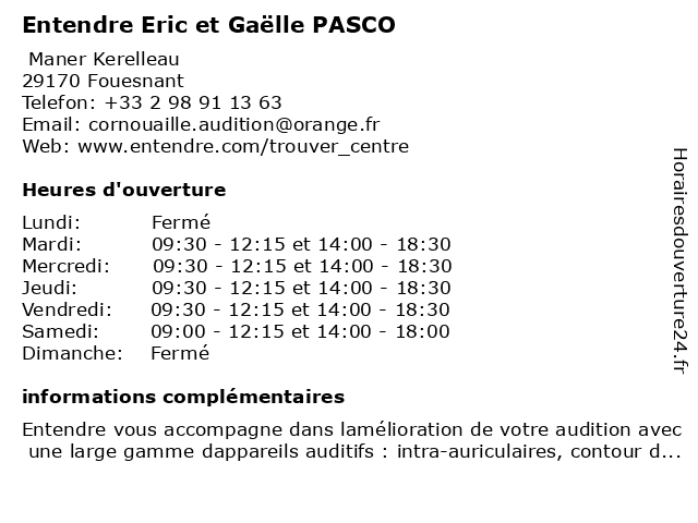 2 Entendre (Distance: 34,53 km) 31 Place Saint-Michel, 29300 Quimperlé auditif, audition, centre, entendre, ouie, quimperlé 6 Entendre Hennebont (Distance: 55,98 km) 9 Avenue Ambroise Croizat, 56700 Hennebont entendre, hennebont |