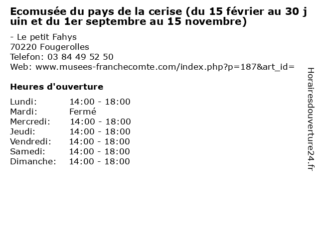1 Ecomusée du pays de la cerise (du 1er juillet au 31 août) (Distance: 0,00 km) - Le petit Fahys, 70220 Fougerolles 1er, 31, ancien, août, art, au, cerise, de, du, ecomusée, exposition, histoire, juillet, la, livre, monument, musée, pays, savoir 2 Office de Tourisme - Plombières-les-Bains (Avr,Mai,Juin,Sept) (Distance: 7,72 km) . Place Maurice Janot, 88370 Plombières-les-Bains avr, bains, bureaux, de, juin, les, mai, office, plombières, sept, services, tourisme 3 CERISE Luxeuil - Les Sources (Distance: 9,48 km) 2 Avenue Jean Moulin, 70300 Luxeuil-les-Bains cerise, les, luxeuil, sources 4 Musée du Combattant de la Haute-Saône - d'avril à novembre (Distance: 9,91 km) - Place de la Baille, 70300 Luxeuil-les-Bains combattant, d'avril, de, du, exposition, haute, la, musée, novembre, saône, visite 5 Boucherie Maison Grandmaire (Décembre à Février) (Distance: 14,61 km) 7 rue de Verdun, 88240 Bains les Bains boucherie, charcuterie, décembre, février, grandmaire, maison, traiteur 6 Médiathèque Intercommunale de la Porte des Vosges - 1er septembre au 30 juin (Distance: 18,77 km) 1 place Jules Méline, 88200 Remiremont 1er, 30, au, cd audio, cd.rom, de, des, intercommunale, juin, la, livres, médiathèque, porte, revues, septembre, vosges |