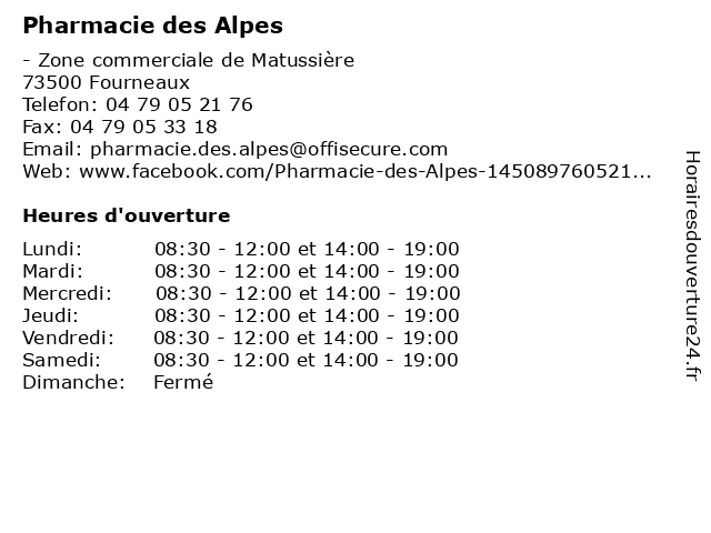 1 Pharmacie des Alpes (Distance: 0,09 km) Avenue de la Liberté, 73500 Fourneaux alpes, bébé, contention/ phlébologie, des, fourneaux, huiles essentielles, location matériel médical, maintien à domicile, modane, orthopédie, parapharmacie, pharmacie 2 Banque Populaire Auvergne Rhône-Alpes (Distance: 0,79 km) 7 rue de la République, 73500 Modane alpes, auvergne, banque, populaire, rhône 5 Le Lys Des Alpes (Distance: 19,46 km) Restaurant Du Lac De Tueda, 73550 Les Allues alpes, lys, restaurants 6 |