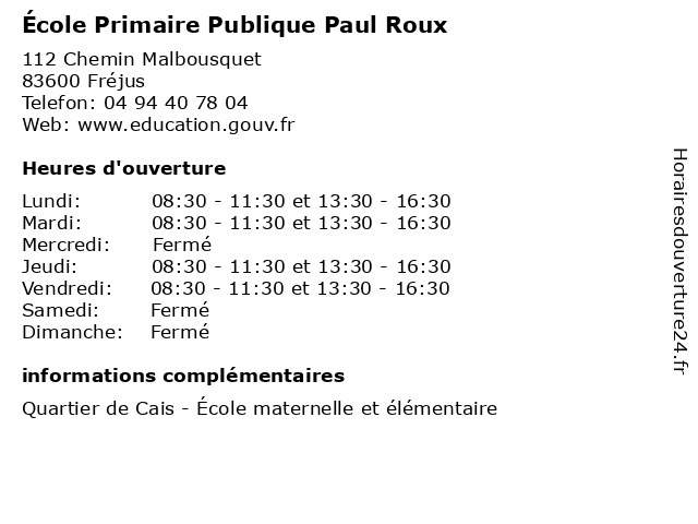 1 École élémentaire publique Paul Roux (Distance: 0,03 km) 112 Chemin Malbousquet, 83600 Fréjus cours, paul, publique, roux, servicios, école, élémentaire 2 École maternelle publique Paul Roux (Distance: 0,51 km) . Chemin du Malbousquet, 83600 Fréjus cours, education, maternelle, paul, publique, roux, services, école 3 Bijouterie Roux Pierre (Distance: 2,39 km) 148 avenue St-Albert, 83480 Puget-sur-Argens accessoires, bijouterie, bijoux, bijoux de fantaisie, montres, pierre, roux 4 Medecin Paul Laval (hépatologue) (Distance: 5,13 km) . Place Pierre Coulet, 83700 Saint-Raphaël docteur, hépatologue, laval, medecin, paul, sante, services 6 Roux Philippe Gabriel (Distance: 16,52 km) Quartier La Ferriere, 83440 Montauroux gabriel, philippe, restaurants, roux |