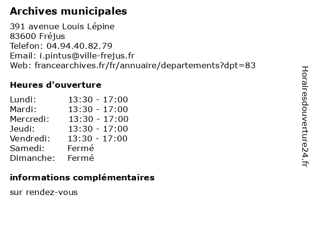 1 Archives municipales (Distance: 5,52 km) 19 impasse Martin Bidouré, 83700 Saint-Raphaël archives, archives departementales, municipales, nationales, regionales 2 Commune de Mandelieu-La-Napoule - Archives municipales (Distance: 17,98 km) - Carrefour de l'Espace, 06210 Mandelieu-La Napoule archives, commune, de, département, départementales, la, mandelieu, municipales, napoule, publique 3 Service archives-documentation (Distance: 19,20 km) . boulevard des Mimosas, 83120 Sainte-Maxime archives, archives departementales, documentation, municipales, nationales, regionales, service 4 Crédit Industriel et Commercial (CIC) (Distance: 5,54 km) 59 Boulevard Félix Martin, 83700 Saint-Raphaël banque, banques, cic, commercial, commerciales, crédit, et, industriel, lyonnaise, nationales 5 Archives départementales du Var (Distance: 22,32 km) 660 boulevard J.-F. Kennedy, 83300 Draguignan archives, archives departementales, du, départementales, municipales, nationales, regionales, var 6 Archives départementales du Var (Distance: 22,32 km) 660 boulevard J.-F. Kennedy, 83300 Draguignan archives, archives departementales, du, départementales, municipales, nationales, regionales, var |