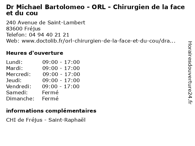 1 Dr Laurent Vazel - ORL - Chirurgien de la face et du cou (Distance: 0,00 km) 240 Avenue de Saint-Lambert, 83600 Fréjus chirurgien, cou, de, dr, du, et, face, la, laurent, orl, vazel 2 Dr Charly Bessadier - ORL - Chirurgien de la face et du cou (Distance: 0,00 km) 240 Avenue de Saint-Lambert, 83600 Fréjus bessadier, charly, chirurgien, cou, de, des, dr, du, et, face, gorge, l'oreille, la, nez, orl, traitement, troubles, tête 3 Dr Olivier Raybaud - ORL - Chirurgien de la face et du cou (Distance: 1,44 km) 127 Rue Joseph Aubenas, 83600 Fréjus chirurgien, cou, de, dr, du, et, face, la, laryngologie, olivier, orl, oto, raybaud, rhino 4 Dr Laurent Vazel - ORL - Chirurgien de la face (Distance: 1,44 km) 127 Rue Joseph Aubenas, 83600 Fréjus chirurgien, de, dr, face, la, laryngologie, laurent, orl, oto, rhino, vazel 5 Dr Michael Caullery - Chirurgien urologue (Distance: 2,11 km) 222 Place Pierre Coullet, 83700 Saint-Raphaël caullery, chirurgien, dr, medecin, michael, sante, soins, urologue 6 Dr Robert Morgue - ORL (Distance: 2,13 km) 1 Place Pierre Coullet, 83700 Saint-Raphaël dr, laryngologie, morgue, orl, oto, rhino, robert |