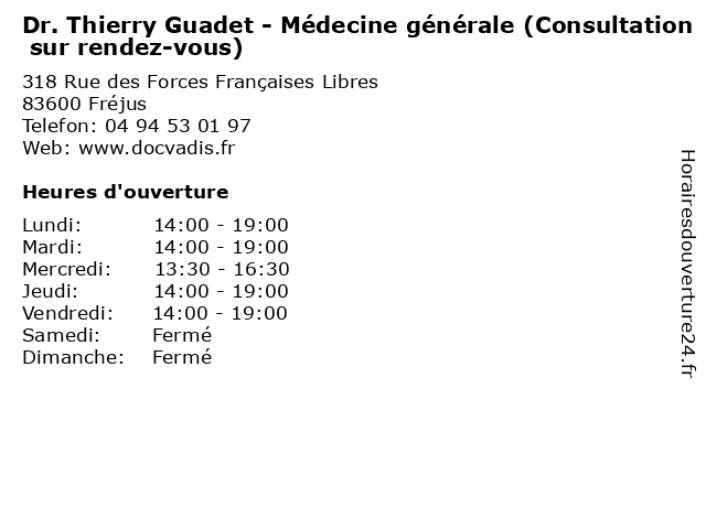 1 Dr. Thierry Guadet - Médecine générale (Distance: 0,00 km) 318 Rue des Forces Françaises Libres, 83600 Fréjus consultation, docteur, dr., guadet, générale, médecine, santé, thierry 2 Centre National d’Information sur les Droits des Femmes et des Famille (Distance: 1,73 km) . Rue Jean Giono, 83600 Frejus centre, des, droits, d’information, et, famille, femmes, les, national, publics, services, sur 3 Dr.Pierre Gras - Médecine générale (Consultation sur rendez-vous) (Distance: 1,82 km) 42 Rue Gambetta, 83700 Saint Raphael consultation, docteur, dr.pierre, gras, générale, médecine, rendez, santé, sur, vous 4 Dr.Pierre Gras - Médecine générale (Consultation sur rendez-vous) (Distance: 1,82 km) 42 Rue Gambetta, 83700 Saint Raphael consultation, docteur, dr.pierre, gras, générale, médecine, rendez, santé, sur, vous 5 Dr.Pierre Gras - Médecine générale (Consultation libre) (Distance: 1,82 km) 42 Rue Gambetta, 83700 Saint Raphael consultation, docteur, dr.pierre, gras, générale, libre, médecine, santé 6 B&B Hotel Frejus Puget-sur-Argens (Distance: 3,05 km) . Rue André Citroën, 83600 Frejus argens, b&b, bar, cafe, frejus, hotel, puget, restaurant, service, sur |