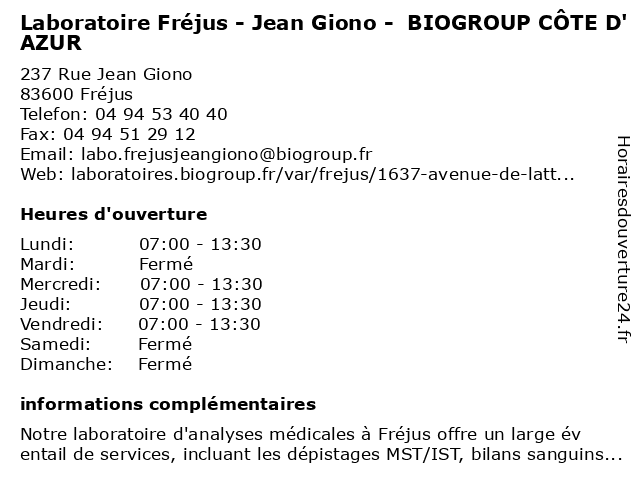 Termes de recherche pour Laboratoire Fréjus - Jean Giono - BIOGROUP CÔTE D'AZUR:frejus, jean, laboratoire, cote, d'azur, giono, biogroup, dépistages, laboratoire de diagnostic |