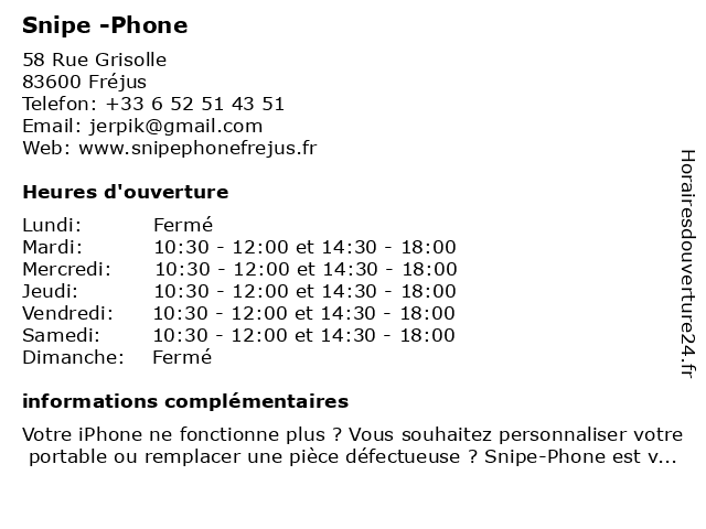 1 Aye Phone (Distance: 0,08 km) 69 Rue du Général de Gaulle, 83600 Fréjus aye, magasin, mobile, mobiles, phone, téléphones, téléphonie 2 Phone Zone Mandelieu (Distance: 19,30 km) 791 Avenue de Fréjus, 06210 Mandelieu-la-Napoule mandelieu, phone, zone 3 The Kase (Distance: 26,26 km) 60 rue d'Antibes, 06400 CANNES covers, kase, mobile phone, tablet accessories, the 4 Relais Colis® / CYBER PHONE SERVICES (Distance: 29,41 km) 8 PLACE AUX AIRES, 06130 GRASSE colis, colis®, cyber, phone, relais, services, services postaux et de livraison 5 Easy Phone (Distance: 51,41 km) 38 Rue de France, 06000 Nice easy, magasins, phone, réparation, smartphones, tablettes 6 BricoMac (Distance: 52,00 km) 51 rue Clément Roassal, 06000 NICE accessories, bricomac, electronics, mobile phone, repair, service |