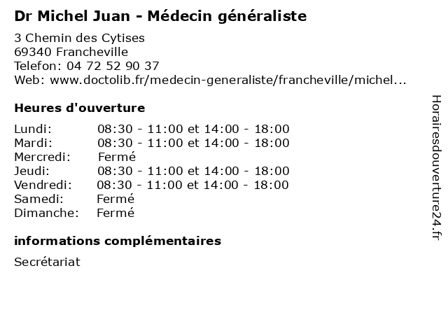 | Jeudi | 08:30-11:00 et 14:00-18:00 |