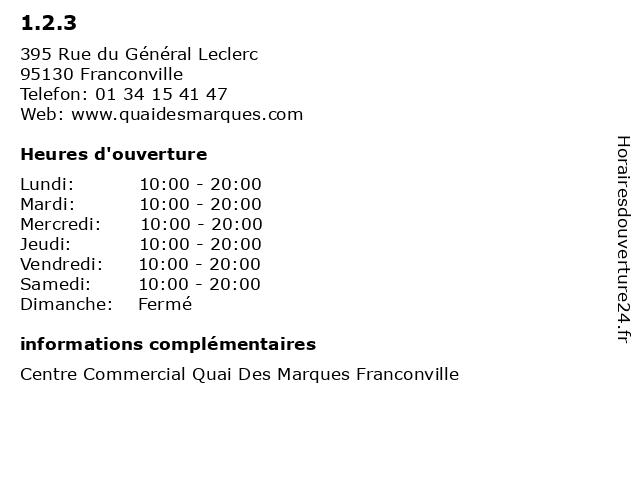 1 1.2.3 (Distance: 10,89 km) 15 parvis de la Défense, 92800 Puteaux 1.2.3, accessoires, mode, mode pour femmes, vêtements pour femmes 2 1.2.3 (Distance: 17,39 km) 101 Porte Berger, 75045 Paris 1.2.3, chaussures, lingerie, mode enfant, mode femmes, mode hemmes, sport 3 1.2.3 (Distance: 19,02 km) . Avenue Charles de Gaulle, 78158 Le Chesnay 1.2.3, beaute, cafe, chaussures, enfants, lingerie, mode femmes, mode hommes, restaurant, sport 4 Armand Ventilo (Distance: 0,00 km) 395 Rue du Général Leclerc, 95130 Franconville armand, cafe, chaussures, enfants, homme, mode femme, parfumeries, restaurant, servicies, sport, ventilo 5 Aubert (Distance: 0,00 km) 395 Rue du Général Leclerc, 95130 Franconville aubert, cafe, chaussures, enfants, homme, mode femme, parfumeries, restaurant, servicies, sport 6 Banana Moon (Distance: 0,00 km) 395 Rue du Général Leclerc, 95130 Franconville banana, cafe, chaussures, enfants, homme, mode femme, moon, parfumeries, restaurant, servicies, sport |