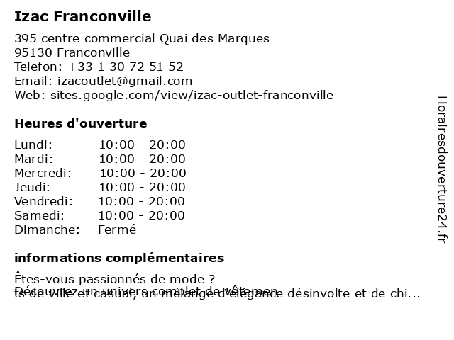 1 Izac (Distance: 11,33 km) 4 Boulevard Gallieni, 92390 Villeneuve-la-Garenne accessoires, chaussures, homme, izac, maroquinerie, mode 2 Izac (Distance: 11,71 km) 8/9 Quai du Chatelier, 93450 L'Ile Saint Denis beaute, chaussures, izac, lingerie, mode enfants, mode femmes, mode hommes, sport 3 Izac (Distance: 11,83 km) 15 Parvis de la Défense, 92092 Puteaux centre, commercial, defense, izac, la, les, paris, temps 5 Izac (Distance: 15,13 km) 32 rue Marbeuf, 75008 Paris accessoires pour hommes, izac, prêt à porter, vêtements 6 IZAC (Distance: 15,23 km) 1 Cour de Rome, 75008 Paris alimentation, beauté & sante, culture & loisirs, enfants, high-tech, izac, maison & déco, mode, restaurants |