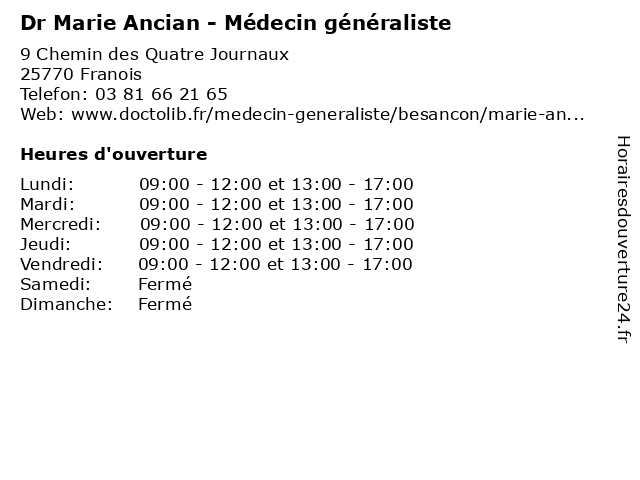 1 Dr Marie Ancian - Médecin généraliste (Distance: 6,72 km) 4c Rue de la Préfecture, 25000 Besançon ancian, centre, de, dentaire, dentiste, dr, granvelle, généraliste, implantologie, marie, médecin, médico, parodontologie, santé 2 Dr Valérie Girard - Médecin généraliste (Distance: 0,00 km) 9 Chemin des Quatre Journaux, 25770 Franois docteur, dr, generaliste, girard, généraliste, medecin, médecin, soins, valérie 3 Dr Valérie Gillet - Médecin généraliste - secrétariat (Distance: 0,16 km) 9 Chemin des Quatre Journaux, 25770 Franois consultation, docteur, dr, gillet, généraliste, med, médecin, médecine, secrétariat, traitement, valérie 4 Dr. Marie-Lucie Fabre- Médecine générale (Distance: 0,41 km) 2 Rue René Char, 25000 Besançon consultation, docteur, dr., fabre, générale, lucie, marie, médecine, santé 5 Boulangerie Marie Blachère (Distance: 1,45 km) - Rue Jouffroy, 25770 Franois blachere, blachère, boulangerie, boutique, marie, pains, patisseries, sandwich 6 Dr Benoît Rabier - Médecin généraliste (Distance: 4,55 km) 4B Rue des Marronniers, 25115 Pouilley-les-Vignes benoît, consultations, docteur, dr, généraliste, médecin, médical, rabier |