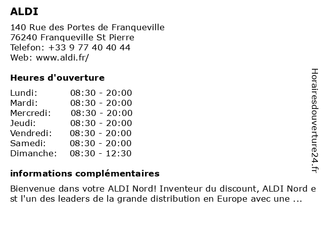 1 Aldi (Distance: 0,56 km) - Rue Jehan le Povremoyne, 76240 Le Mesnil-Esnard aldi, alimentaire, alimentation, courses, distributeur, supermarché, supérette, épicerie 2 Aldi (Distance: 6,15 km) - boulevard de l'Europe, 76100 Rouen aldi, alimentaire, alimentation, courses, distributeur, distribution, grande, hypermarché, supermarché, supérette, épicerie 4 Aldi (Distance: 9,69 km) 2 Rue Samuel Lecoeur, 76000 Rouen aldi, alimentaire, alimentation, courses, distributeur, distribution, grande, hypermarché, leader, price, supermarché, supérette, épicerie 6 |