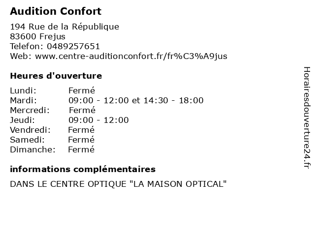 1 Audition Confort (Distance: 5,24 km) 1129 Avenue de la Corniche d'Azur, 83370 Saint-Aygulf auditif, audition, centre, confort, sante 2 Audition Confort (Distance: 6,26 km) 644 Rue du Général de Gaulle, 83480 Puget-sur-Argens audition, confort 4 Audition Confort (Distance: 16,87 km) 185 Boulevard de la Libération, 83490 Le Muy auditif, audition, centre, confort, sante 5 Audition Conseil (Distance: 0,78 km) 112 Place Pierre Coullet, 83700 Saint Raphael aide auditive, audition, conseil, santé, spécialiste 6 |
