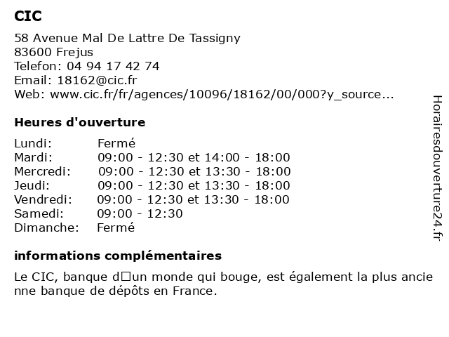 1 CIC (Distance: 0,58 km) 291 Rue Jean Jaures, 83600 Frejus cic, compagnie de téléphone, organisme d'assurance 2 CIC (Distance: 2,16 km) 32 Place Marechal Gallieni, 83700 St Raphael cic, compagnie de téléphone, organisme d'assurance 3 CIC (Distance: 2,18 km) 59 Boulevard Felix Martin, 83700 St Raphael cic, compagnie de téléphone, organisme d'assurance 4 CIC (Distance: 9,25 km) 2540 Route Nationale 7, 83520 Roquebrune Sur Argens cic, compagnie de téléphone, organisme d'assurance 5 CIC (Distance: 15,80 km) 82 Route Du Plan De La Tour, 83120 Ste Maxime cic, compagnie de téléphone, organisme d'assurance 6 Crédit Industriel et Commercial (CIC) (Distance: 0,03 km) 58 Avenue de Lattre de Tassigny, 83600 Fréjus agence, assurance, banque, cic, commercial, credit industriel et commercial, crédit, et, industriel |