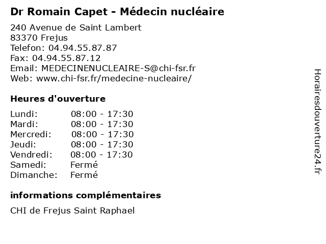 1 Dr Guillaume Loubet - Médecin nucléaire (Distance: 0,00 km) 240 Avenue De Saint Lambert, 83370 Frejus dr, guillaume, loubet, médecin, médecins, médicaments, nucléaire, santé, secrétariat, spécialiste 2 Boulangerie Pâtisserie - Romain Corretel (Distance: 2,00 km) 1 rue d'Agay, 83700 Saint-Raphaël alimentation, baguette, boulangerie, commerce, corretel, gâteaux, pain, pâtisserie, romain, saint-raphaël 3 Saint Romain (Distance: 2,17 km) 110 Allee Fontaine De Valescure, 83700 St Raphael bailleurs, biens, immobiliers, nra, romain, saint 4 Vert D'azur - Romain Rubio (Distance: 2,47 km) 281 Traverse Jean Moulin, 83700 Saint-Raphaël d'azur, romain, rubio, vert 5 Romain Ruschke - Pédicure-podologue (Distance: 4,11 km) 225 Rue Isaac Newton, 83700 Saint-Raphaël cheville, orteil, pied, podologue, pédicure, romain, ruschke 6 Dr Romain Richy - Chirurgien-dentiste (Distance: 5,79 km) 127 Rue Victor Hugo, 83480 Puget-sur-Argens chirurgien, dentaire, dentiste, dr, implantologie, parodontologie, richy, romain |