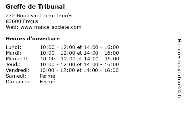 1 Greffe de Tribunal - (Horaires d'Ouvertures de I'Accueil Telephonique ) (Distance: 0,00 km) 272 Boulevard Jean Jaurès, 83600 Frejus d'ouvertures, de, greffe, horaires, i'accueil, publics, services, telephonique, tribunal 2 Tribunal d'Instance (Distance: 0,00 km) 268 rue Jean-Jaurès, 83608 Frejus administration, assoc, d'instance, de, frejus, services, services publics, tribunal 3 Tribunal D'Instance (Distance: 26,28 km) 19 boulevard Carnot, 064154 Cannes administration, assoc, d'instance, services, services publics, tribunal 4 Greffe de Tribunal (Distance: 26,28 km) 19 Boulevard Carnot, 06414 Cannes de, greffe, publics, services, tribunal 5 Tribunal De Grande Instance (Distance: 29,18 km) 37 avenue Pierre Semard, 06133 Grasse administration, assoc, de, grande, instance, services, services publics, tribunal 6 Greffe de Tribunal (Distance: 29,18 km) 37 Avenue Pierre Semard, 06130 Grasse de, greffe, publics, services, tribunal |