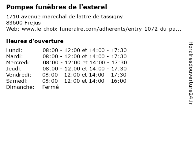 1 Pompes Funèbres ROBLOT (Distance: 0,34 km) 216 Avenue du Général Leclerc, 83700 Saint-Raphaël avis de décès, crémation, entretien de sépulture, fleurs deuil, formalités après obsèques, funèbres, inhumation, marbrerie, monument funéraire, pompes, pompes funèbres, prévoyance obsèques, roblot 2 AZUR POMPES FUNÈBRES (Distance: 0,82 km) 552 552 Avenue André Léotard, 83600 Fréjus azur, funèbres, pompes 3 Pompes Funèbres Roc-Eclerc (Distance: 1,02 km) 599 Avenue de Lattre de Tassigny, 83600 Fréjus articles funéraires, assistance rapatriement, démarches admnistratives, eclerc, fleurs fraîches, funèbres, gestion des obsèques, pompes, prévoyance obsèques, roc, travaux de marbrerie et cimetière 4 Pompes Funèbres Libres Cristol Ghio (Distance: 1,41 km) 552 Avenue André Léotard, 83600 Fréjus cristol, funèbres, ghio, libres, pompes 5 Pompes Funèbres Cristol-Ghio (Distance: 1,66 km) 765 Boulevard Jean Moulin, 83700 Saint-Raphaël cristol, funèbres, ghio, pompes 6 Pompes funèbres PFG FRÉJUS (Distance: 2,48 km) 390 Rue Joseph Aubenas, 83600 Fréjus avis de décès, crémation, entretien de sépulture, fleurs deuil, formalités après obsèques, fréjus, funèbres, inhumation, marbrerie, monument funéraire, pfg, pompes, pompes funèbres, prévoyance obsèques |