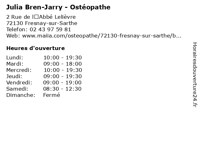 1 Julia Collet - Naturopathe (Distance: 37,00 km) 23 Rue Daniel Saint-Pol, 72100 Le Mans collet, julia, medecin, naturopathe, plante, sante 3 Julia Bureau - Ostéopathe (Distance: 45,42 km) 7 Place Saint-Lhomer, 61390 Courtomer bureau, julia, ostéo, ostéopathe, ostéopathes, soins 6 Coiff&Co (Distance: 0,13 km) - Rue de l'Abbé Lelièvre, 72130 Fresnay-sur-Sarthe cheveux, coiff&co, coiffure, esthétique, salon, soins |