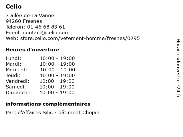 1 Celio (Distance: 3,09 km) . Rue du Luxembourg, 94320 Rungis accessoires, celio, enfants, femmes, habillement, homme, magasin, mode, pret à porter, vetements 2 Celio (Distance: 7,99 km) . Chemin de Briis, 91141 Villebon sur Yvette accessoires, celio, mode, vêtements 3 Celio (Distance: 8,53 km) 2 Avenue de l'Europe, 78140 Vélizy-Villacoublay accessoires, celio, chemises, costumes, mode, vêtements 4 Celio (Distance: 9,21 km) 3 Allee Sainte Lucie, 92130 ISSY-LES-MOULINEAUX beaute, cafe, celio, chaussures, enfants, maison, mode femmes, mode hommes, restaurant, sport 5 Celio (Distance: 9,70 km) 22 Rue du Départ, 75015 Paris beaute, cafe, celio, chaussures, enfants, mode femmes, mode hommes, restaurant, sport 6 Celio (Distance: 10,58 km) . Ville de Bois, 91620 La Ville du Bois beaute, cafe, celio, chaussures, enfants, hommes, lingerie, mode femmes, restaurant, sport |