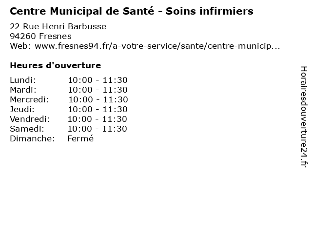 1 Centre Municipal de Santé - Soins infirmiers (Distance: 6,02 km) 9 Rue Ledru Rollin, 94600 Choisy-le-Roi bureau, centre, consultation, de, dr, infirmiers, maladie, med, municipal, médecin, médecine, pratique, santé, soins, thérapie, traitement 2 Centre Municipal de Santé - Soins Infirmiers (Distance: 7,17 km) 74 Avenue Pierre-Larousse, 92240 Malakoff bureau, centre, consultation, de, dr, infirmiers, maladie, med, municipal, médecin, médecine, pratique, santé, soins, thérapie, traitement 3 Centre Municipal de Santé - Soins infirmiers (Distance: 13,94 km) 3 Rue du Maine, 91940 Les Ulis bureau, centre, consultation, de, dr, infirmiers, maladie, med, municipal, médecin, médecine, pratique, santé, soins, thérapie, traitement 4 Centre Municipal de Santé - Allergologie (Distance: 0,00 km) 22 Rue Henri Barbusse, 94260 Fresnes allergologie, bureau, centre, consultation, de, dr, maladie, med, municipal, médecin, médecine, pratique, santé, thérapie, traitement 5 Centre Municipal de Santé - Pneumologie (Distance: 0,00 km) 22 Rue Henri Barbusse, 94260 Fresnes bureau, centre, consultation, de, dr, maladie, med, municipal, médecin, médecine, pneumologie, pratique, santé, thérapie, traitement 6 Centre Municipal de Santé - Acupuncture (Distance: 0,00 km) 22 Rue Henri Barbusse, 94260 Fresnes acupuncture, bureau, centre, consultation, de, dr, maladie, med, municipal, médecin, médecine, pratique, santé, thérapie, traitement |