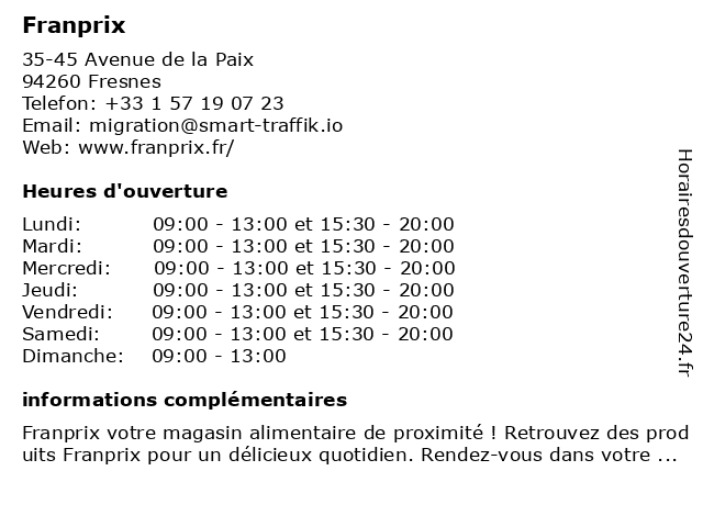 1 Franprix (Distance: 0,30 km) 6 Drue Charcot, 94260 FRESNES alimentation générale, entretien de la maison et de l'hygiène, franprix, franprix magasin, fruits et légumes frais 2 Franprix (Distance: 0,30 km) 6 Rue du Docteur Charcot, 94260 Fresnes bibi, carte de fidélité, courses, franprix, magasin, produits frais, programme de fidélité, supermarché, épicerie 3 Franprix (Distance: 1,59 km) 117-121 Avenue Aristide Briand, 92160 Antony bibi, carte de fidélité, courses, franprix, magasin, produits frais, programme de fidélité, supermarché, épicerie 4 Franprix (Distance: 3,74 km) - Fontaine Mouton, 92160 ANTONY alimentation générale, entretien de la maison et de l'hygiène, franprix, franprix magasin, fruits et légumes frais 5 Franprix (Distance: 5,53 km) 25 av. Charles Gide, 94270 LE KREMLIN BICÊTRE alimentation générale, entretien de la maison et de l'hygiène, franprix, franprix magasin, fruits et légumes frais 6 Franprix (Distance: 5,65 km) 37 avenue Jean Jaurès, 94110 Arcueil alimentation, franprix, fruits, legumes, superettes |