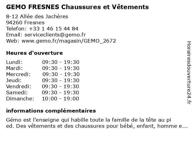 1 Besson Chaussures (Distance: 0,04 km) 4-6 Allée des Jachères, 94263 Fresnes accessoires, besson, chaussure, chaussures, enfants, femmes, hommes, mode 2 Gemo (Distance: 0,13 km) . Rue de la Loge, 94260 Fresnes cafe, chaussures, enfants, gemo, homme, lingerie, mode femme, restaurant 3 Chaussures Michel Sté (Distance: 1,80 km) 14 Avenue Aristide Briand, 92160 Antony chaussures, michel, sté 4 La Halle Aux Chaussures (Distance: 3,14 km) . Avenue Du Luxembourg, 94531 Thiais aux, belle, centre, chaussures, commercial, epine, halle, la, thiais 5 La Halle aux Vêtements et Chaussures (Distance: 7,85 km) . Chemin de Briis, 91141 Villebon sur Yvette accessoires, aux, chaussures, et, halle, la, mode, vêtements 6 Simon's - Vêtements & Chaussures (Distance: 9,24 km) 12 Boulevard Arago, 75013 Paris chaussures, magasins, simon's, sport, vetements, vintage, vêtements |