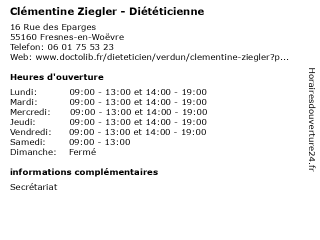 1 Clémentine Ziegler - Diététicienne (Distance: 18,73 km) 3 Place Thiers, 55100 Verdun aliment, clementine, clémentine, dieticien, diététicienne, medecin, nutrition, ziegler 2 Elodie Chardin - Diététicienne (Distance: 13,29 km) 22 Place Jean Baptiste Rouillon, 55400 Étain aliment, chardin, dieticien, diététicienne, elodie, medecin, nutrition 3 Dr Laurent Ziegler - Médecin généraliste (Distance: 18,90 km) 2 rue d'Anthouard, 55107 Verdun consultation, docteur, dr, généraliste, laurent, med, médecin, médecine, traitement, ziegler 4 Aurelie Mathiot - Diététicienne (Distance: 19,92 km) 4 Rue Commandant Drouot, 55430 Belleville-sur-Meuse alimentation, aurelie, dieteticien, diététicienne, mathiot, nourriture, sante 5 Dietplus (Distance: 37,33 km) 331 rue de Pont-A-Mousson, 57950 Montigny-Les-Metz alimentation, dietplus, diététique, fitness, nutrition 6 Laurette Eustache - Diététicienne (Distance: 38,97 km) 3 Impasse du Saule, 57140 Woippy aliment, dieticien, diététicienne, eustache, laurette, medecin, nutrition |