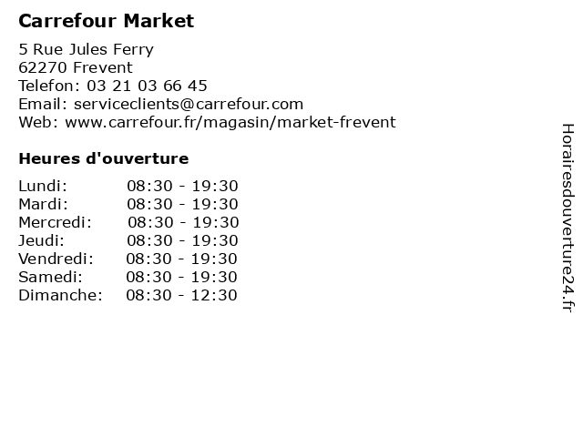1 Carrefour Market (Distance: 11,79 km) 7 Boulevard Carnot, 62130 Saint-Pol-sur-Ternoise alimentation, carrefour, magasin discount, market, supermarché 2 Carrefour Drive (Distance: 0,02 km) 5 Rue Jules Ferry, 62270 Frévent alimentaire, carrefour, courses, drive, en ligne, magasin 3 Carrefour Contact (Distance: 11,95 km) 19 Route nationale 39, 62130 Saint Michel Sur Ternoise carrefour, contact, electrical appliances, furnitures, garden equipment, shelving 4 Carrefour (Distance: 14,87 km) - Grand, 32000 Auch carrefour, hard discount, hypermarchés, les dépanneurs, supermarchés 5 Carrefour Contact (Distance: 18,33 km) 11 Route de Canaples, 80370 Bernaville alimentaire, alimentation, carrefour, contact, courses, distributeur, hypermarché, supermarché, épicerie 6 Carrefour Contact (Distance: 18,84 km) - Route Grincourt les Pas, 62760 Pas En Artois alimentation, carrefour, contact, express, magasin discount, market, supermarché |