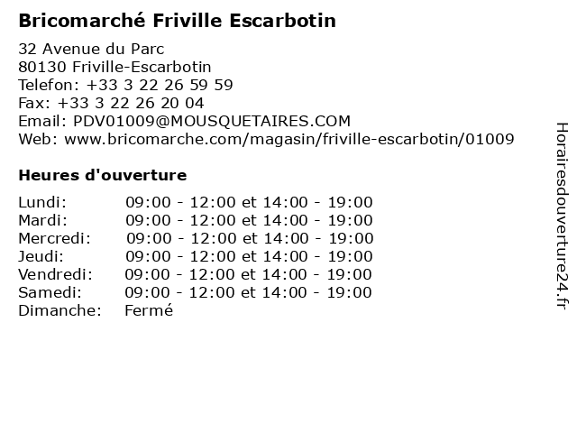 2 Bricomarché Saint-Valery-Sur-Somme (Distance: 13,16 km) Cavée Lévêque, 80230 Saint-Valery-sur-Somme bricomarché, saint, somme, sur, valery 3 Bricomarché Bouttencourt (Distance: 16,25 km) Avenue du Président Roosevelt, 80220 Bouttencourt bouttencourt, bricomarché 4 Bricomarché Abbeville (Distance: 21,53 km) 18 Côte de la Justice, 80100 Abbeville abbeville, bricomarché 6 |