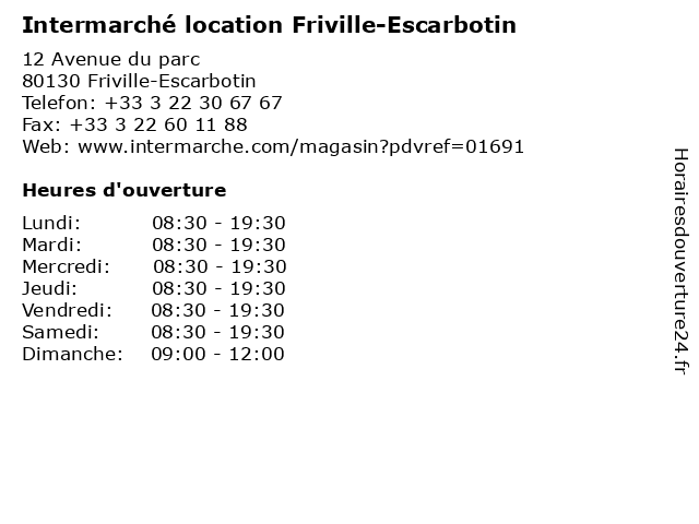 1 Intermarché SUPER Friville-Escarbotin (Distance: 0,00 km) 12 Avenue du parc, 80130 Friville-Escarbotin escarbotin, friville, intermarché, super 2 Intermarché station-service Friville-Escarbotin (Distance: 0,05 km) 12 Avenue du Parc, 80130 Friville-Escarbotin escarbotin, friville, intermarché, service, station 3 Home Location Services Saint Quentin la Motte Croix au Bailly (Distance: 4,88 km) 240 Rue Eolis, 80880 Saint-Quentin-la-Motte-Croix-au-Bailly au, bailly, croix, home, la, location, motte, quentin, saint, services 4 Intermarché location Eu (Distance: 9,05 km) ZI Nord des Prés Salés Route de Mers, 76260 Eu eu, intermarché, location 5 E.Leclerc Location (Distance: 13,01 km) - route départementale 925, 76260 Etalondes auto, e.leclerc, fourgon, location, voiture 6 Intermarché station-service Saint-Valery-sur-Somme (Distance: 13,31 km) Cavée Lévêque, 80230 Saint-Valery-sur-Somme intermarché, saint, service, somme, station, sur, valery |