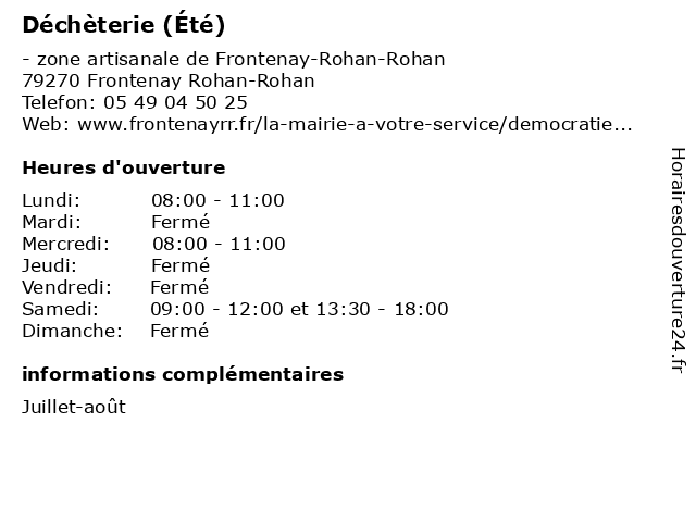 1 Déchèterie (Été) (Distance: 5,86 km) - Rue François Guibert, 79000 Bessines bennes, collecte, débarras, déchets, déchèterie, ordures, été 2 Déchèterie (été) (Distance: 6,60 km) - d'Aiffres, 79230 Aiffres déchèterie, gravats, huiles usées, la réception des déchets et écocentres, les appareils électroménagers, les déchets verts, papier et carton en quantité, été 3 Déchèterie (Été) (Distance: 6,88 km) - Le Haut Pié Blanc, 79210 Prin-Deyrançon bennes, collecte, débarras, déchets, déchèterie, ordures, été 4 Déchèterie (Été) (Distance: 9,62 km) - lieu-dit Le Bois Fort, 79360 Beauvoir-sur-Niort bennes, collecte, débarras, déchets, déchèterie, ordures, été 5 Déchèterie (Été) (Distance: 12,09 km) - Rue de Sérigny, 79000 Niort bennes, collecte, débarras, déchets, déchèterie, ordures, été 6 Déchèterie (Été) (Distance: 16,18 km) - lieu-dit La Gadrouille, 79230 Prahecq bennes, collecte, débarras, déchets, déchèterie, ordures, été |