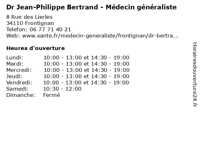 1 Dr Bertrand Billet - Médecin généraliste (Distance: 3,01 km) 1 Rue Aristide Briand, 34110 Frontignan bertrand, billet, consultation, docteur, dr, généraliste, med, médecin, médecine, secrétariat, traitement 2 Dr. Marion Bertrand - Médecine générale (Consultation sur rendez-vous) (Distance: 3,11 km) 149 Quai d'Orient, 34200 SETE bertrand, consultation, docteur, dr., générale, marion, medecins, médecine, rendez, santé, sur, vous 3 Dr. Marion Bertrand - Médecine générale (Consultation sur rendez-vous en alternance avec le Dr. Escudero) (Distance: 3,11 km) 149 Quai d'Orient, 34200 SETE alternance, avec, bertrand, consultation, docteur, dr., en, escudero, générale, le, marion, medecins, médecine, rendez, santé, sur, vous 4 Dr. Marion Bertrand - Médecine générale (Consultation libre) (Distance: 3,11 km) 149 Quai d'Orient, 34200 SETE bertrand, consultation, docteur, dr., générale, libre, marion, medecins, médecine, santé 6 Dr Philippe Bonnet - Oto-Rhino-Laryngologue (Distance: 3,34 km) 1 Quai du Pavois d’Or, 34200 Sète bonnet, dr, laryngologie, laryngologue, orl, oto, philippe, rhino |