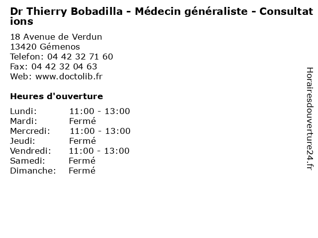 1 Dr Thierry Bobadilla - Médecin généraliste - secretariat (Distance: 0,00 km) 18 Avenue de Verdun, 13420 Gémenos bobadilla, dr, généraliste, médecin, médecine, médical, pharmaceutique, secretariat, thierry, traitement 2 Muller Thierry Jean-Philippe (Distance: 4,51 km) 18 Boulevard Jean Jaures, 13400 Aubagne jean, muller, philippe, restaurants, thierry 3 Dr Thierry Fareau - Chirurgien-dentiste - secrétariat (Distance: 12,57 km) 24 Avenue Salvador Allende, 13600 La Ciotat chirurgien, chirurgien-dentiste, dentiste, dr, fareau, médecins, médicaments, santé, secrétariat, spécialiste, thierry 4 Dr Thierry Tranier - Chirurgien plasticien et esthétique - secrétariat (Distance: 15,70 km) 96 Avenue des Caillols, 13012 Marseille chirurgien, consultation, docteur, dr, esthétique, et, med, médecin, médecine, plasticien, secrétariat, thierry, traitement, tranier 5 Dr Thierry Cohen - Chirurgien-dentiste - secrétariat (Distance: 17,33 km) 263 Boulevard Romain Rolland, 13009 Marseille chirurgien, cohen, consultation, dentiste, docteur, dr, med, secrétariat, thierry 6 Dr Thierry Bensousan - Anesthésiste - secrétariat (Distance: 18,80 km) - Traverse de l'Antignane, 13008 Marseille anesthésiste, bensousan, consultation, docteur, dr, med, médecin, médecine, secrétariat, thierry, traitement |