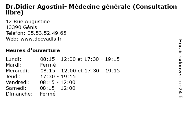 Termes de recherche pour Dr.Didier Agostini- Médecine générale (Consultation libre):générale, medecine, santé, libre, docteur, consultation, agostini, dr.didier |