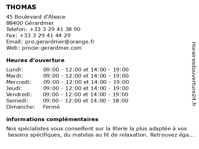 1 PRO&Cie - Ent. Thomas (Distance: 0,01 km) 45 Boulevard d'Alsace, 88400 Gérardmer art de la table, canape, cuisine, decoration, electromenager, ent., literie, multimedia, pro&cie, thomas 2 Thomas Audition (Distance: 0,51 km) 7 Rue de la 3ème Dia et du 2ème Rsar, 88400 Gérardmer audition, thomas 3 THOMAS JEAN PHILIPPE SAS (Distance: 12,77 km) 156 Rue Marie Joséphine Walter, 88640 Granges-Aumontzey jean, philippe, sas, thomas 5 EURO REPAR Garage Thomas Frères (Distance: 18,67 km) 710 Rue de Bruyères, 88600 Laval-sur-Vologne euro, frères, garage, repar, thomas 6 Boulangerie Pâtisserie Thomas (Distance: 18,80 km) 33 Rue de la Poste, 88600 Lépanges alimentation, baguette, boulangerie, commerce, gâteaux, lépanges, pain, pâtisserie, thomas |