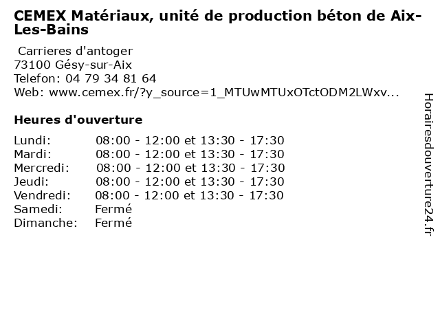 Termes de recherche pour CEMEX Matériaux, unité de production béton de Aix-Les-Bains:aix, les, de, bains, unité, materiaux, beton, production, cemex, fournisseur de matériel pour le béton |