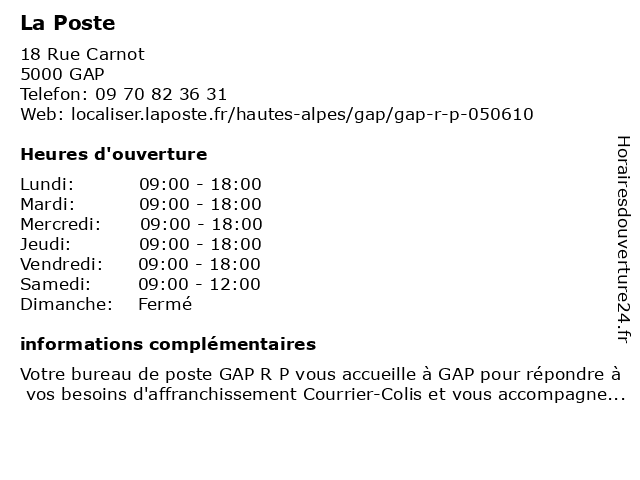 1 La Poste (Distance: 7,05 km) - La Gravière, 05130 Saint-Étienne-le-Laus agence, assurance, banque, banque postale, bureau de poste, chronopost, colis, courrier, dps, expéditions internationales, la, point, postale, poste, relais, timbres, téléphonie, ups, western union 2 La Poste (Distance: 9,08 km) - Quartier Parquet, 05230 La Bâtie-Neuve agence, assurance, banque, banque postale, bureau de poste, chronopost, colis, courrier, dps, expéditions internationales, la, point, postale, poste, relais, timbres, téléphonie, ups, western union 4 La Poste (Distance: 9,55 km) - La Place du Village, 05400 La Roche-des-Arnauds agence, assurance, banque, banque postale, bureau de poste, chronopost, colis, courrier, dps, expéditions internationales, la, point, postale, poste, relais, timbres, téléphonie, ups, western union 6 La Poste (Distance: 9,68 km) - Le Village, 05500 Saint-Laurent-du-Cros agence, assurance, banque, banque postale, bureau de poste, chronopost, colis, courrier, dps, expéditions internationales, la, point, postale, poste, relais, timbres, téléphonie, ups, western union |