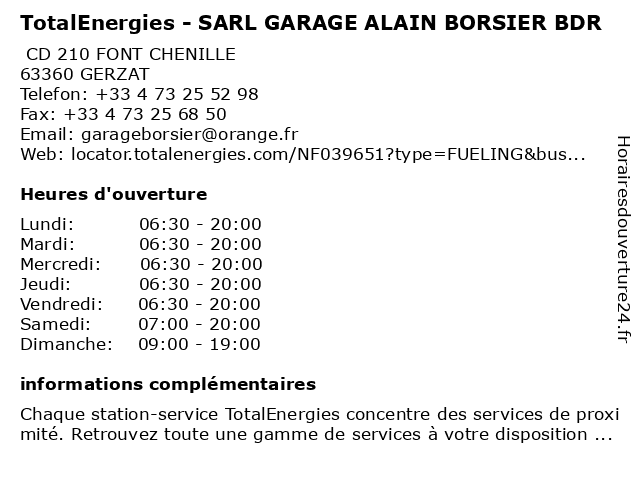 Termes de recherche pour TotalEnergies - SARL GARAGE ALAIN BORSIER BDR:garage, sarl, alain, total, gas station, borsier, station service, bdr, tankstelle, totalenergies |