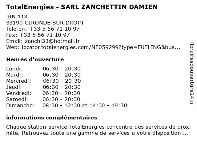 Termes de recherche pour TotalEnergies - SARL ZANCHETTIN DAMIEN:sarl, total, damien, gas station, station service, zanchettin, tankstelle, totalenergies |