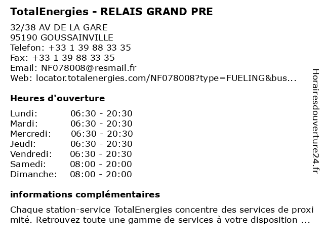 Termes de recherche pour TotalEnergies - RELAIS GRAND PRE:relais, grand, total, pré, gas station, station service, tankstelle, totalenergies |