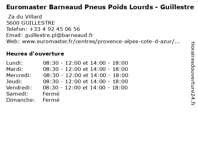 1 Barneaud Pneus (Distance: 0,13 km) - Zone d'activité du Villard, 05600 Guillestre auto, barneaud, batterie, climatisation, diagnostic, entretien, euromaster, freinage, géométrie, parallélisme, pneu, pneus, révision, vidange, voiture, véhicule 3 Euromaster Barneaud Pneus - Guillestre (Distance: 2,51 km) ZA DU VILLARD, 05600 GUILLESTRE barneaud, batterie voiture, centre auto, essuie glace, euromaster, garage, garage auto, garage automobile, garagiste, guillestre, liquide de frein, parallélisme, plaquette de frein, pneu, pneu 4 saisons, pneu hiver, pneu michelin, pneu pas cher, pneus, pneus pas cher, pneus pas chers, pression pneu, promo pneu, recharge clim voiture, revision voiture, vidange, vidange voiture 5 Ab Pneus Services (Distance: 15,33 km) . Avenue Charles de Gaulle, 05120 L'Argentière La Bessée ab, automobile, entretien, garage, montage, pneus, réparation, services, vidange 6 AD CARROSSERIE GAILLARD JEAN-MARC (Distance: 0,13 km) Le Villard Nord, 05600 Guillestre ad, carrosserie, courroie de distribution, devis réparation voiture, entretien auto, gaillard, garage, jean, marc, revision voiture, réparateur voiture, réparation carrosserie, vidange |