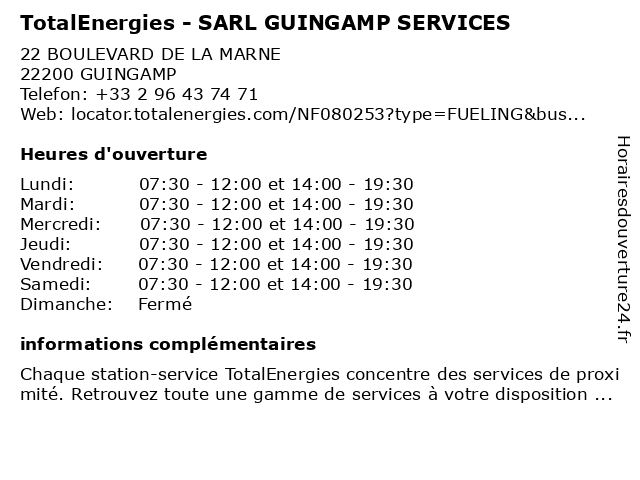 Termes de recherche pour TotalEnergies - SARL GUINGAMP SERVICES:services, sarl, total, guingamp, gas station, station service, tankstelle, totalenergies |