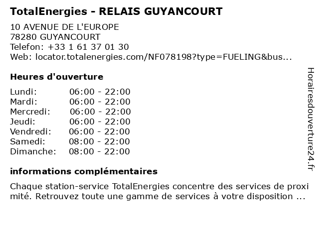 Termes de recherche pour TotalEnergies - RELAIS GUYANCOURT:relais, total, guyancourt, gas station, station service, tankstelle, totalenergies |