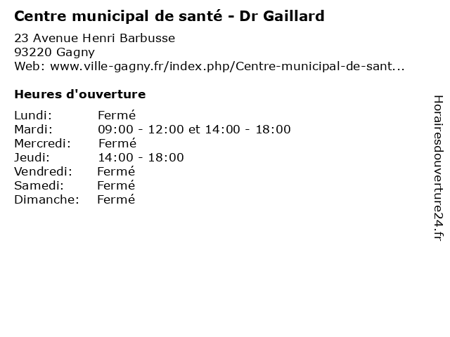 1 Centre municipal de santé (Distance: 0,00 km) 23 Avenue Henri Barbusse, 93220 Gagny bureau, centre, consultation, de, dr, maladie, med, municipal, médecin, médecine, pratique, santé, thérapie, traitement 2 Centre municipal de santé - Dr Jean-Baptiste (Distance: 0,00 km) 23 Avenue Henri Barbusse, 93220 Gagny baptiste, bureau, centre, consultation, de, dr, jean, maladie, med, municipal, médecin, médecine, pratique, santé, thérapie, traitement 3 Centre municipal de santé - Dr Petit (Distance: 0,00 km) 23 Avenue Henri Barbusse, 93220 Gagny bureau, centre, consultation, de, dr, maladie, med, municipal, médecin, médecine, petit, pratique, santé, thérapie, traitement 4 Centre Municipal de Santé (secrétariat ) (Distance: 5,50 km) 6 Avenue Robert Ballanger, 93270 Sevran centre, consultation, de, docteur, municipal, médecins, santé, secrétariat 5 Multi-accueil municipal - En accueil régulier (Distance: 7,14 km) n/a Rue du Maréchal Joffre, 77177 Brou-sur-Chantereine accueil, caregivers houses, child care, en, family home, home care, kindergartens, micro-nurseries, multi, municipal, parental home, régulier 6 Multi-accueil municipal - En accueil occasionnel (Distance: 7,14 km) n/a Rue du Maréchal Joffre, 77177 Brou-sur-Chantereine accueil, caregivers houses, child care, en, family home, home care, kindergartens, micro-nurseries, multi, municipal, occasionnel, parental home |