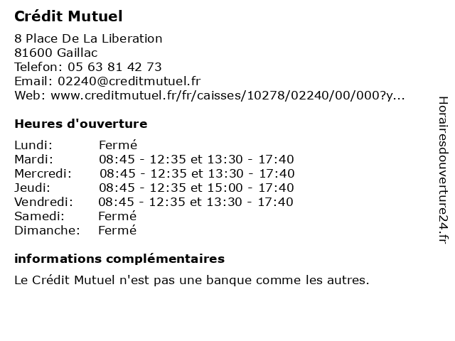 1 Crédit Mutuel (Distance: 0,02 km) 8 Place de la Libération, 81600 Gaillac assurances, bancaire, banque, crédit, mutuel, services 2 Crédit Mutuel (Distance: 16,98 km) 34 Avenue Charles de Gaulle, 81300 Graulhet assurances, bancaire, banque, crédit, mutuel, services 3 Crédit Mutuel (Distance: 16,99 km) 34 Avenue Charles De Gaulle, 81300 Graulhet compagnie de téléphone, crédit, mutuel, organisme d'assurance 4 Crédit Mutuel (Distance: 19,04 km) 51 Avenue François Verdier, 81000 Albi assurances, bancaire, banque, crédit, mutuel, services 5 Crédit Mutuel (Distance: 19,04 km) 51 Avenue Francois Verdier, 81000 Albi compagnie de téléphone, crédit, mutuel, organisme d'assurance 6 Crédit Agricole Mutuel Pyrénées Gascogne (Distance: 16,52 km) . Avenue de Lavaur, 81390 Briatexte agricole, assurances, bancaire, banque, crédit, gascogne, mutuel, pyrénées, services |