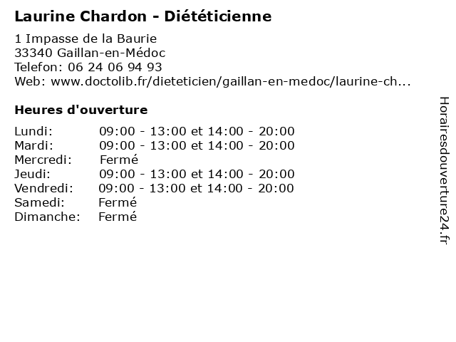 1 Céline Lavielle - Diététicienne (Distance: 3,29 km) 1 Rue du Bourg, 33340 Gaillan-en-Médoc alimentation, céline, dieteticien, diététicienne, lavielle, nourriture, sante 2 Lucie Daugeron - Diététicienne (Distance: 3,56 km) 20 Route de Lesparre, 33340 Gaillan-en-Médoc alimentation, daugeron, dieteticien, diététicienne, lucie, nourriture, sante 3 Céline Lavielle - Diététicienne (Distance: 8,05 km) 2 Route des Parriances, 33340 Bégadan alimentation, céline, dieteticien, diététicienne, lavielle, nourriture, sante 4 Vanessa Loury - Diététicienne (Distance: 12,77 km) 46 Avenue de l'Europe, 33930 Vendays-Montalivet alimentation, dieteticien, diététicienne, loury, nourriture, sante, vanessa 5 Geneviève Besseiche - Diététicienne (Distance: 24,01 km) 50 bis Rue du Maréchal Joffre, 33250 Pauillac alimentation, besseiche, dieteticien, diététicienne, genevieve, geneviève, nourriture, sante 6 Maïté Sadoine - Diététicienne (Distance: 30,29 km) 181 Avenue des Semis, 17200 Royan alimentation, dieteticien, diététicienne, maïté, nourriture, sadoine, sante |
