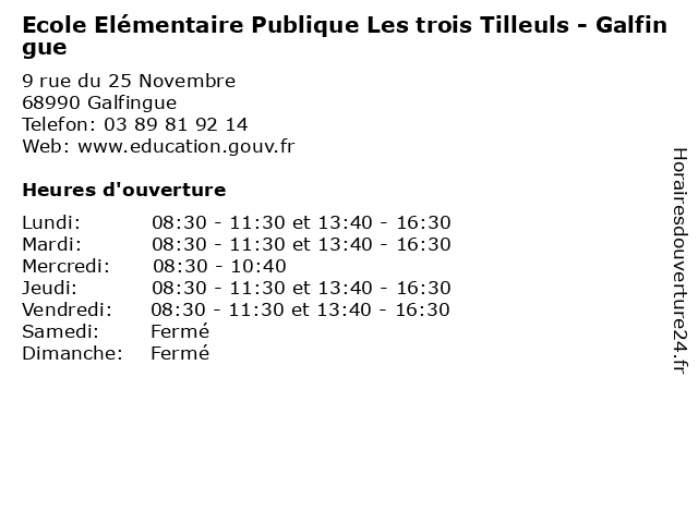 | Mardi | 08:30-11:30 et 13:40-16:30 |