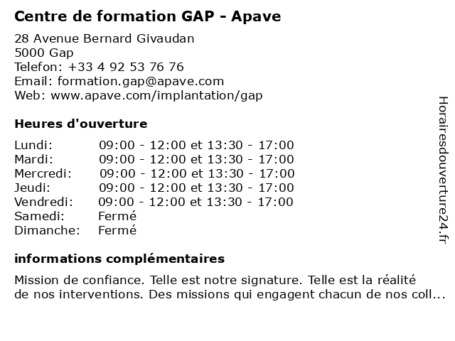 1 Apave Gap (Distance: 0,00 km) 28 Avenue Bernard Givaudan, 05000 Gap amiante, apave, bâtiment, certification, conformité, conformité réglementaire, construction, essais et mesures, formation, gap, inspection bâtiment, vérification périodique 2 UELAS/Université d'Etudes et de Loisirs des Alpes du Sud Centre de formation associatif (Distance: 1,09 km) Belle Aureille, 05000 Gap alpes, associatif, centre, d'etudes, de, des, du, et, formation, loisirs, sud, uelas/université 3 ADFPA 05 - Centre de Formation Agricole et Rurale (Distance: 3,65 km) 10 Rue des Silos, 05000 Gap 05, adfpa, agricole, association, centre, de, et, formation, rurale 4 AFTRAL - Centre de Formation (Distance: 5,00 km) - Quartier Serre Niou, 05000 Gap aftral, centre, cfatl, de, diplomes, ecole, formation, l’alternance, particulier, professionnel, supérieure 5 URMA PACA (Distance: 0,39 km) 10 Route de Graffinel, 05000 Gap apprentissage, de, des, formation, l’artisanat, métiers, paca, régionale, université, urma, Établissement, école 6 Auto Ecole Zig-Zag (Distance: 31,61 km) 3 Place de la Fontaine, 05300 Laragne-Monteglin 125 cm3, accompagnee, auto, conduite, ecole, formation remorque, permis, scooter, supervisee, zag, zig |